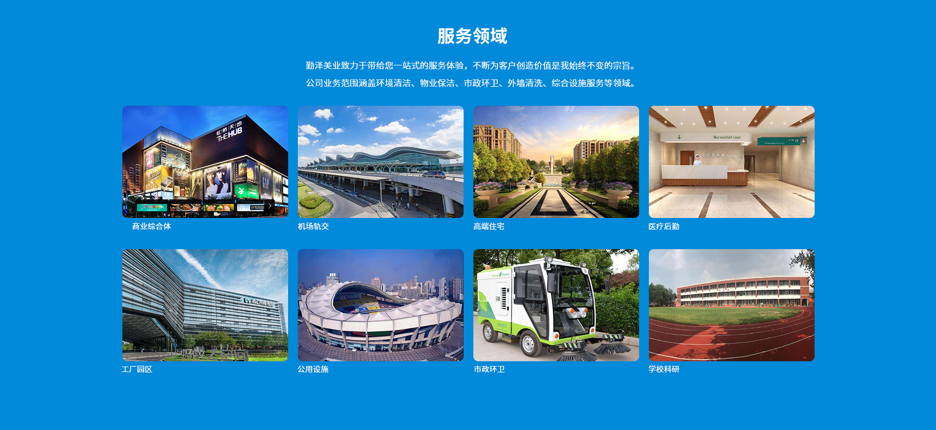 公司致力于把“勤澤美業(yè)”培育成眾口皆碑、令人尊敬、具有長期價值的服務(wù)領(lǐng)袖品牌。業(yè)務(wù)范圍涵蓋環(huán)境清潔和綜合設(shè)施管理服務(wù),公司具備環(huán)衛(wèi)、保潔、石材等多個行業(yè)一級資質(zhì),致力成為中國環(huán)境服務(wù)行業(yè)的領(lǐng)導(dǎo)者。